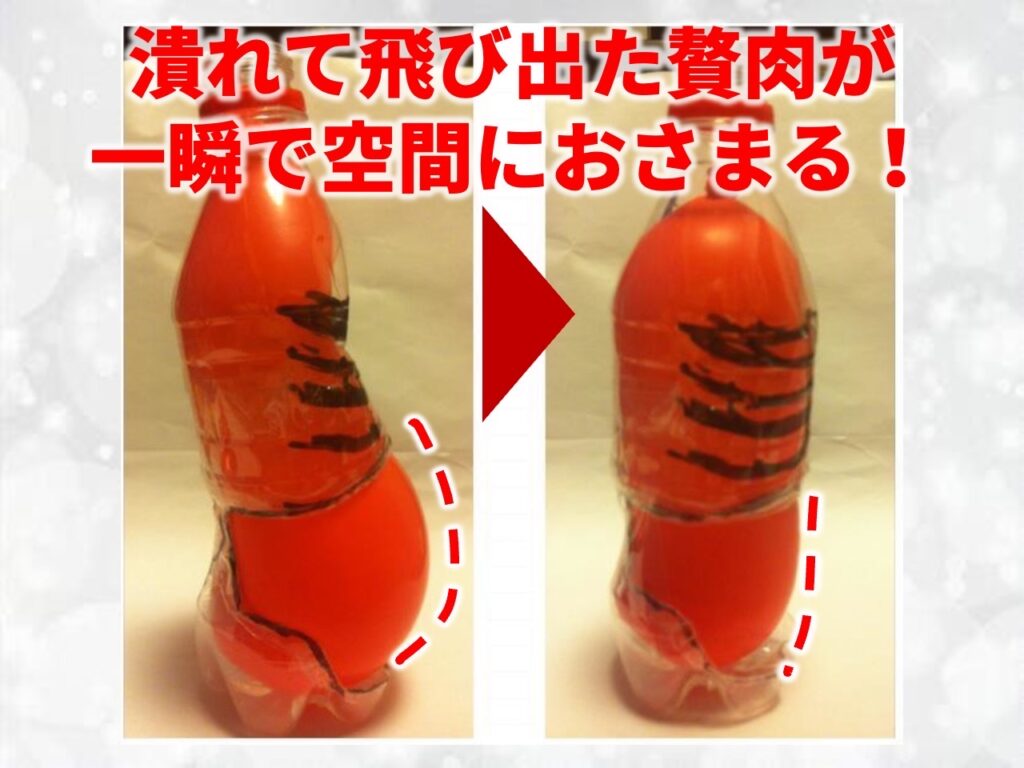 中の空気が潰れてしまうと、ボトルの形は歪み、外に膨らみが飛び出してしまいます。